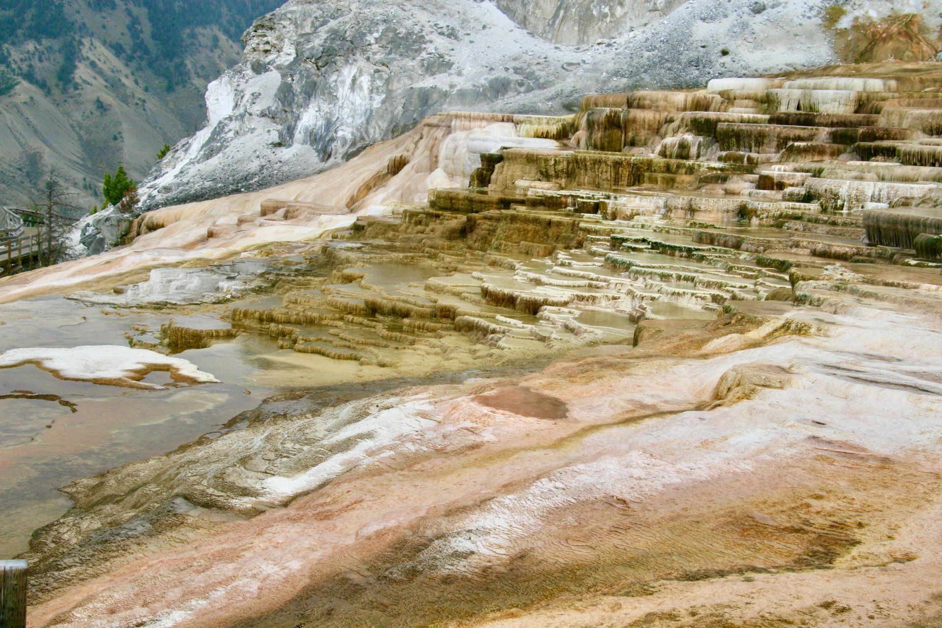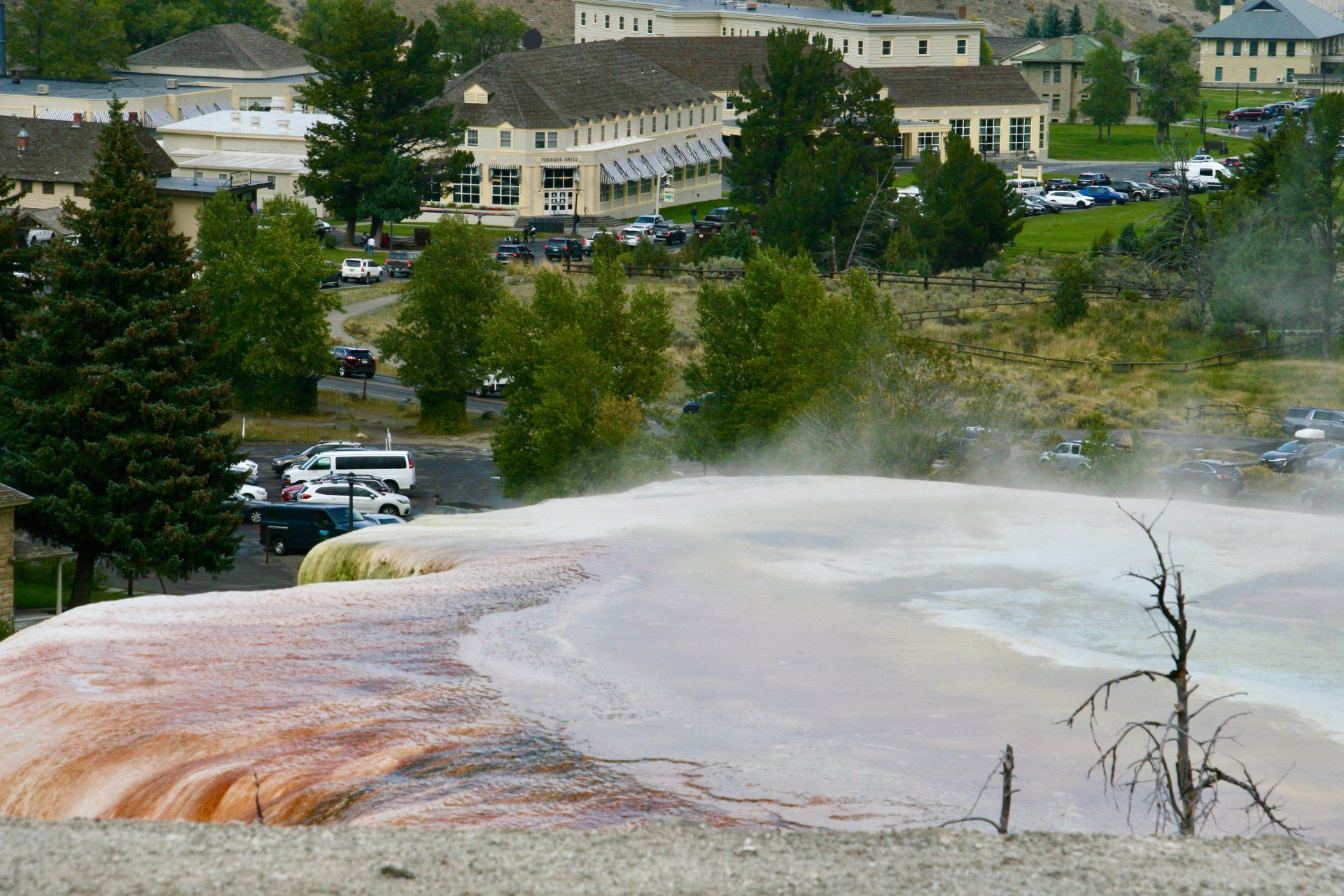 Mammoth Hot Springs se fait à pieds et en voiture. Nous avons fait les deux, bien entendu, pour ne rien manquer de ces merveilles géologiques. C'est le site le plus visité à Yellowstone après Old Faithful et Grand Prismatic. Ici, c'est différent des autres sources thermales en raison de la présence de calcaire, roche relativement molle, permettant aux formations de travertin (roche sédimentaire) de se développer beaucoup plus rapidement que les autres formations.
