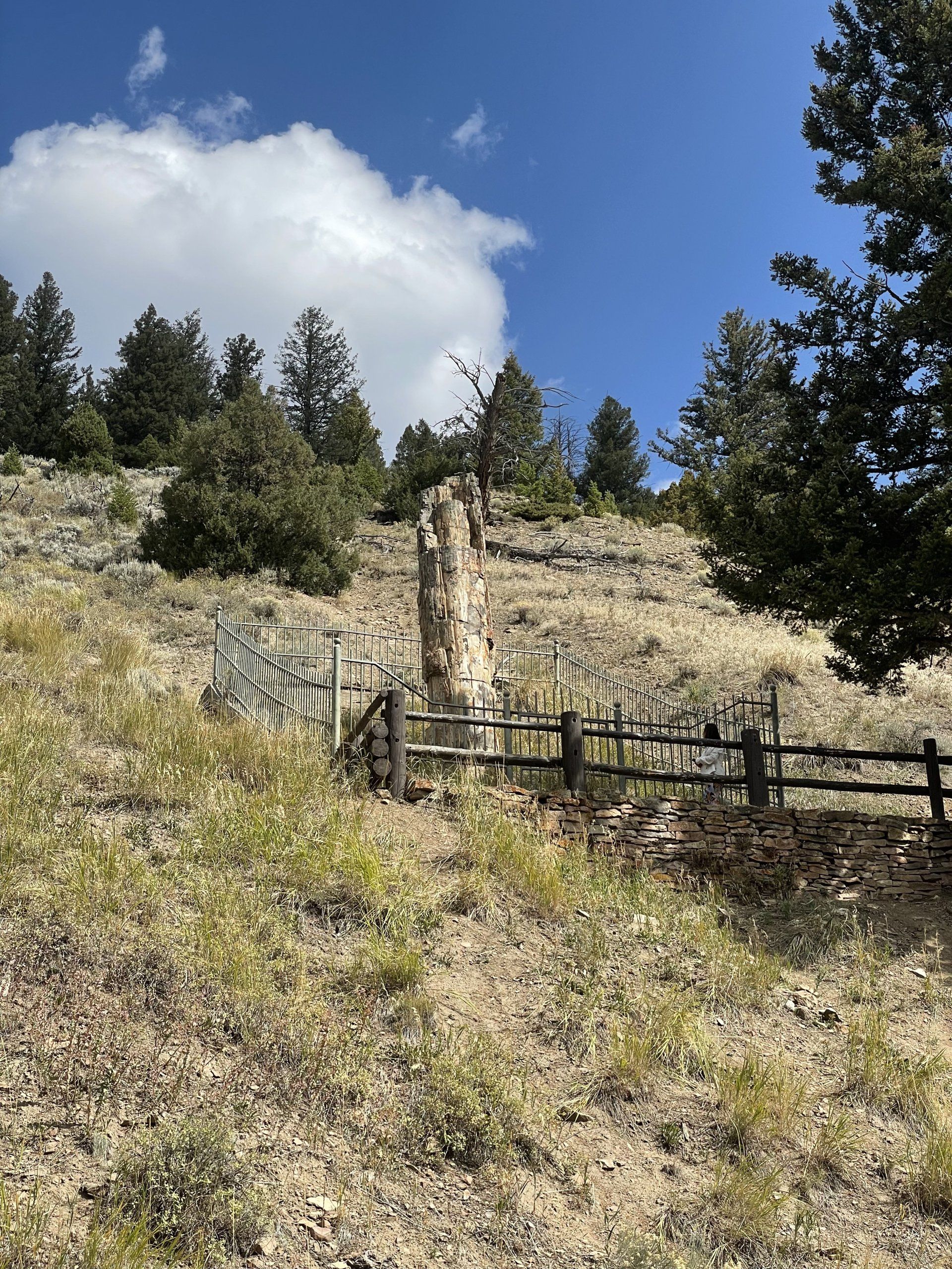 C'est toujours un plaisir de revenir dans le parc et tomber sur ces animaux dont nous ne nous lassons pas de photographier.... puis nous faisons un arrêt pique-nique en pleine nature après avoir vu Petrified Tree, qui, il y a des millions d'années était un Sequoia géant entouré de ses congénères. Lors de violentes éruptions volcaniques, des coulées de boue et des dépôts volcaniques ont rapidement rempli les pores ouverts de l'arbre, le solidifiant dans le tronc rocheux que vous voyez aujourd'hui. Là où il y en avait autrefois deux, il ne reste plus qu'un seul arbre pétrifié. Dans les premiers jours du parc, il y a 150 ans, les visiteurs et les explorateurs prenaient des morceaux du deuxième arbre jusqu'à ce qu'il n'y ait plus rien à prendre. Une clôture entoure l'arbre restant afin qu'il soit protégé et toujours debout pour les générations à venir. Une route goudronnée de 1/4 mile qui quitte la Grand Loop Road vous ramènera à cette merveille géologique.